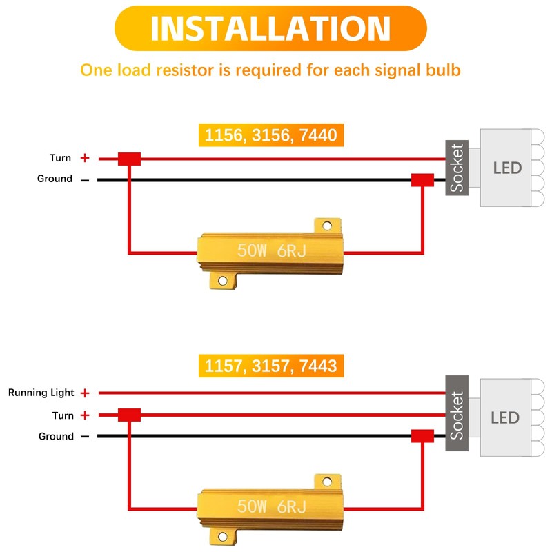 This 50 Watts 6Ohm LED Load Resistors will work on any vehicle and can be connected across the turn signal bulbs to simulate the load of a regular filament bulb (2 Amp load). This will solve 3157 1157(BAY15D) LED related turn signal lights problems such as hyper flashing, no flashing or burnt out bulb indications
