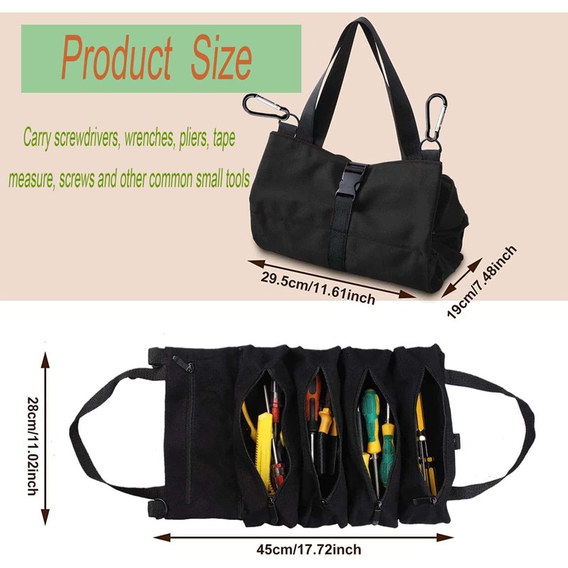 - 2.UNCTIONAL DESIGN:The tool roll bags has 5 zippered pockets to organize and categorize your wrenches, screwdrivers, tape measure and some other small tools, and it can be used as a handbag or hung on the seat of your car
