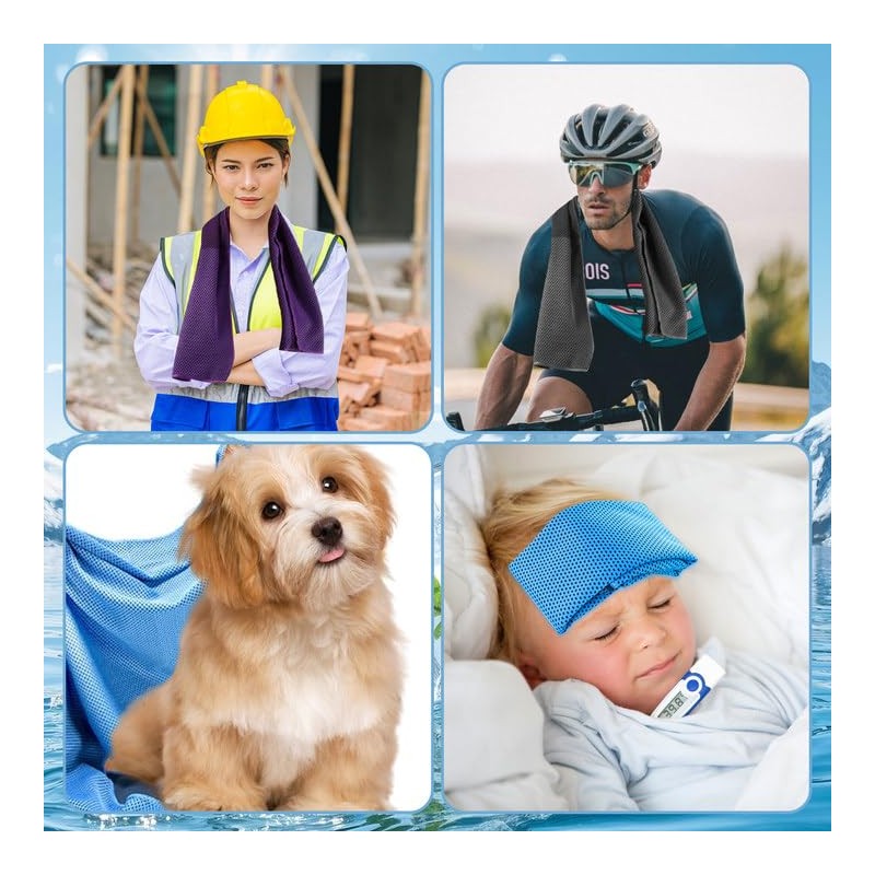 - MULTIFUNCTIONAL COOLING TOWEL: This cool towel is perfect for exercise enthusiasts who love yoga, sports, exercise, gym, swimming, golf, running, camping and fitness. It is also ideal for outdoor workers who work in hot environments to prevent sun damage and absorb heat to keep cool. You can also use it to relieve the headache caused by fever, and the physical cooling of burns. Suitable for people of all ages, but also for pets