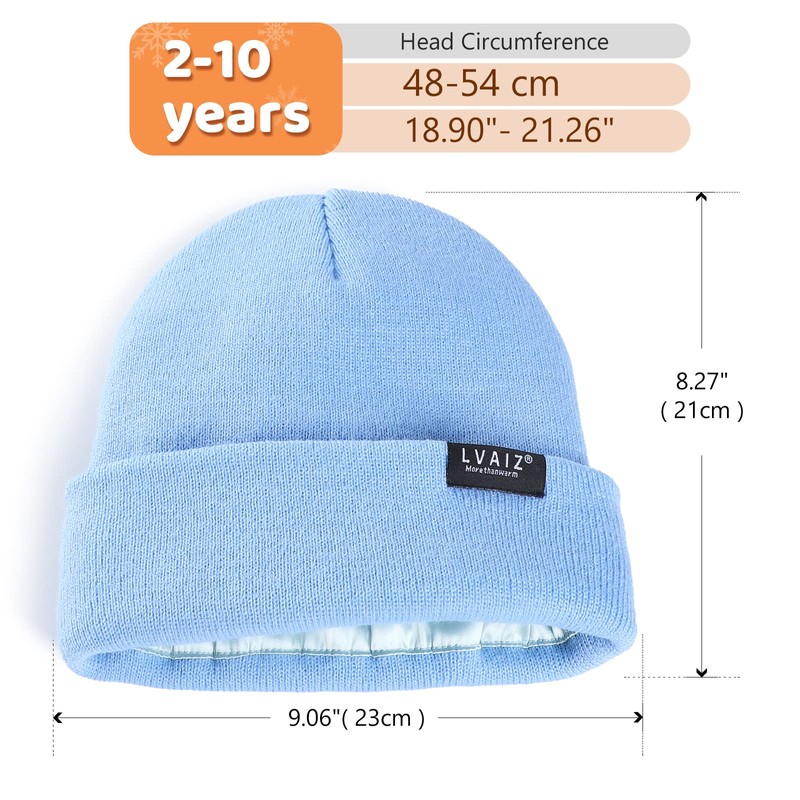 - MATERIAL AND FEATURES: Made of 100% acrylic outer and premium satin lining, this warm silk lined knitted toddler beanie is suitable for kids of 2-10 years old. The classic outer of warm and elastic fabric brings your kids a cute look and provides them with a warm and comfortable wearing experience on those cold days. Combined with a satin layer, this cuff beanie is exceptional for kids!