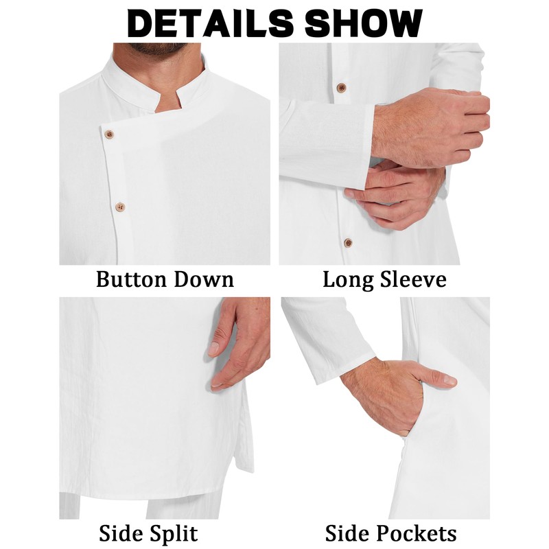 LVCBL Thobe Mens Leinen Men's Button Up Side Split Kaftan Mens with Pockets Linen Solid Robe White 3XL