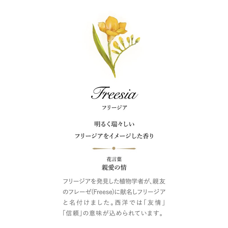 - A bright and fresh scent inspired by freesia: Biologist who discovered Freesia has given the name of Freesia and named Freesia. In the western the meaning of "friendship" and "trust"