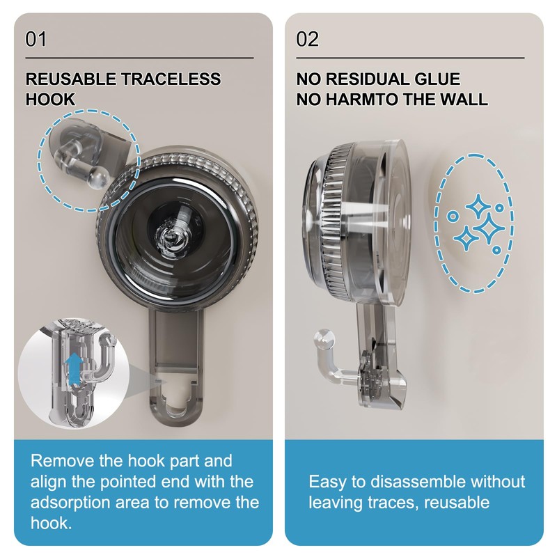 - [Reusable & Easy Maintenance] The hook detaches from the suction hooks for separate cleaning or replacement. If suction weakens, gently pry the edge with a credit card or the hook tip, soak in warm water, and air-dry to restore strong adhesion. Reuse infinitely, cost-effective