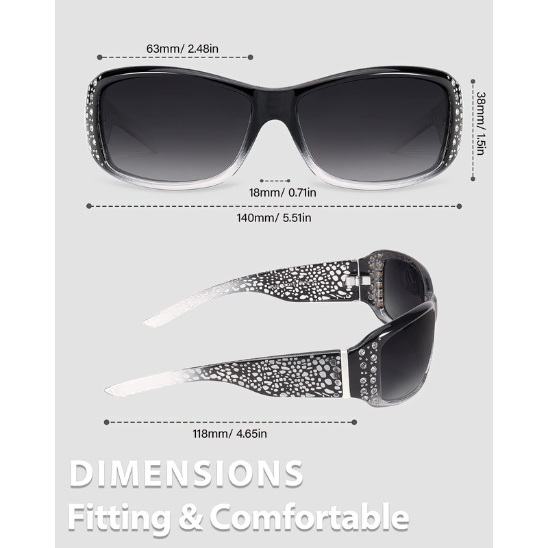 Mit ihrem stilvollen Design, dem hervorragenden Schutz und der bequemen Passform ist diese Sonnenbrille die perfekte Wahl für jede Outdoor-Aktivität oder den Alltag. Die einzigartige gesprenkelte Textur auf beiden Seiten der Bügel verleiht dieser ohnehin schon atemberaubenden Sonnenbrille einen zusätzlichen Hauch von Eleganz. VORTEILE DES TRAGENS EINER LVIOE-SONNENBRILLE ? Komfort: Diese Sonnenbrille ist nicht nur modisch, sondern auch bequem und langlebig. Filtern Sie die schädlichen UV-Strahlen der Sonne. ?Wenn Sie nach einer Sonnenbrille suchen, die Ihre Augen vor schädlichen UV-Strahlen schützt und Sie gleichzeitig stilvoll aussehen lässt. Verbessern Sie die Klarheit. ?Polarisierte Gläser verringern die Ermüdung der Augen und verbessern den Sehkomfort durch Reduzierung der Blendung von hellen Straßenoberflächen und Wasserreflexionen, sodass alles klarer aussieht. PRODUKTINFORMATIONEN Polarisiert: Ja UV400-Schutz: Ja Rahmenform: Quadratisch Rahmenbreite: 63 mm/ 2,48 Zoll Linsenhöhe: 38 mm/ 1,5 Zoll Linsenbreite: 63 mm/ 2,48 Zoll Brückenbreite: 18 mm/ 0,71 Zoll Bügellänge: 118 mm/ 4,65 Zoll WAS SIE ERHÄLT eine Sonnenbrille *1 Benutzerhandbuch *1 Polarisationstestkarte *1 sauberes Tuch *1 weiche Tasche *1 Tipps: ?Vermeiden Sie die Verwendung von Papierhandtüchern, Taschentüchern oder Toilettenpapier zum Reinigen Ihrer Brillengläser. Der Zellstoff in Papierhandtüchern und Taschentüchern kann Ihre Brillengläser zerkratzen oder sie voller Flusen hinterlassen. Spülen Sie Ihre Gläser unter einem leichten Strahl lauwarmen Leitungswassers ab. Dadurch wird der Staub entfernt und verhindert, dass Sie Ihre Linsen beim Reinigen zerkratzen. Verwenden Sie zum Reinigen von Gläsern kein heißes Wasser, da dies die Linsenbeschichtung beschädigen kann sowie eine gesprenkelte Textur auf beiden Seiten der Bügel, die Ihrem Alltagslook einen Hauch von Raffinesse verleiht. Die funkelnden Strasssteine und die strukturierten Bügel sind ein echter Hingucker und setzen überall ein