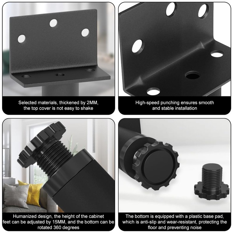 - Easy installation: you do not need to lift the furniture, but can easily attach the cabinet feet to the furniture. After punching and fixing the holes, you can adjust the height of the furniture legs to the floor, so you can perform the installation quickly and without complicated installation steps.