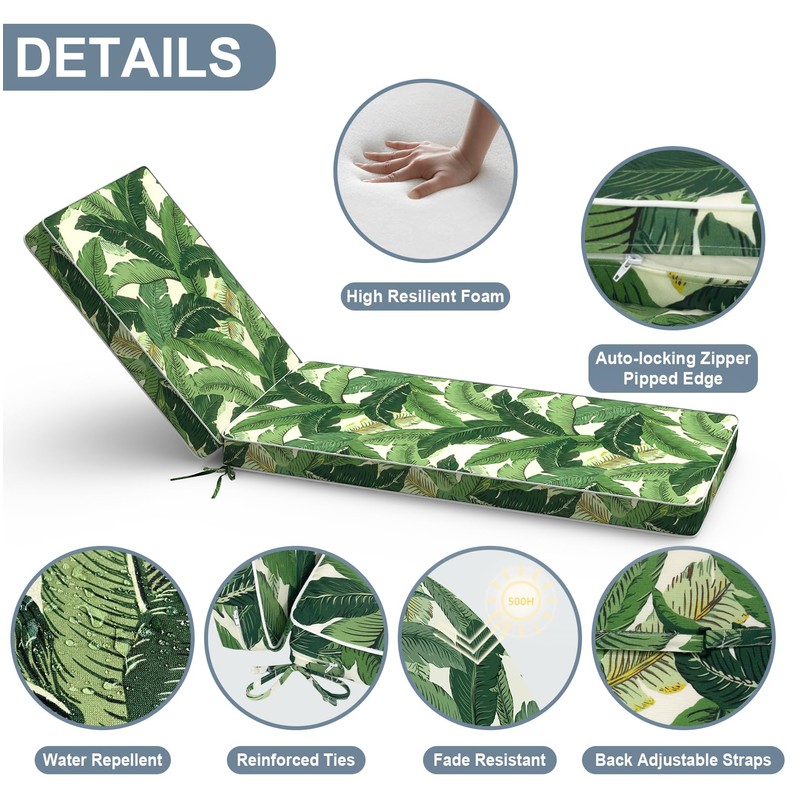- đAdjustable Ties and Piped Edge Design: 4 Ties and back adjustable straps keep your chaise lounge cushions securely fastened to the furniture, brings you great comforts. Piped edge design not only reinforces the edges but also makes your outdoor lounge chair cushions more stylish.
