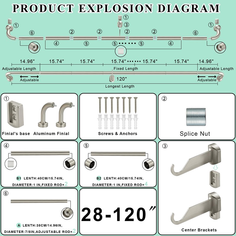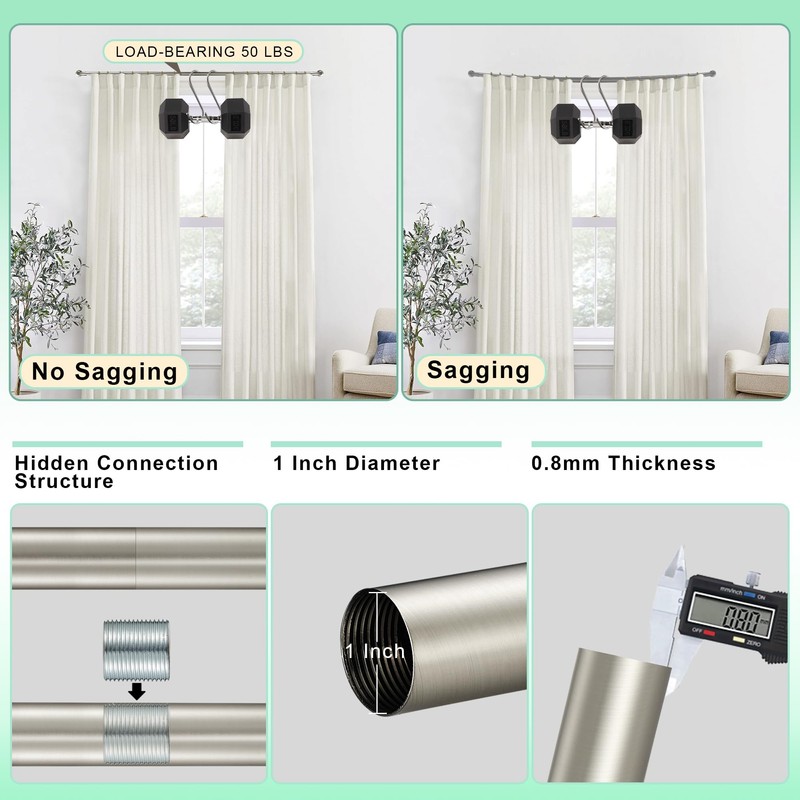 • ADJUSTABLE CURTAIN ROD - Lwiiom brushed nickel curtain rod for windows 28 to 120 inch features a hidden internal splicing structure for easy disassembly, storage and transportation.