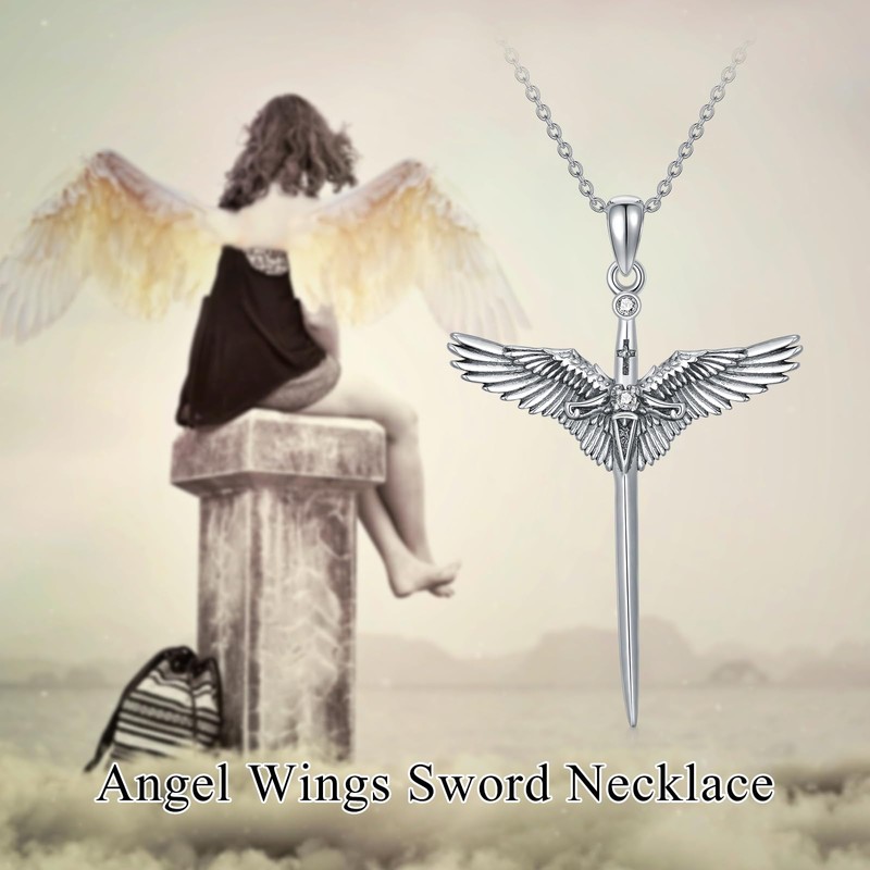 LWXIE Diamond Angel Wings Sword Necklace 925 Sterling Silver Angel Wings Sword Pendant Sword of Faith Necklace Jewelry Gifts for Women Wife Girlfriend, Sterling Silver, Diamond