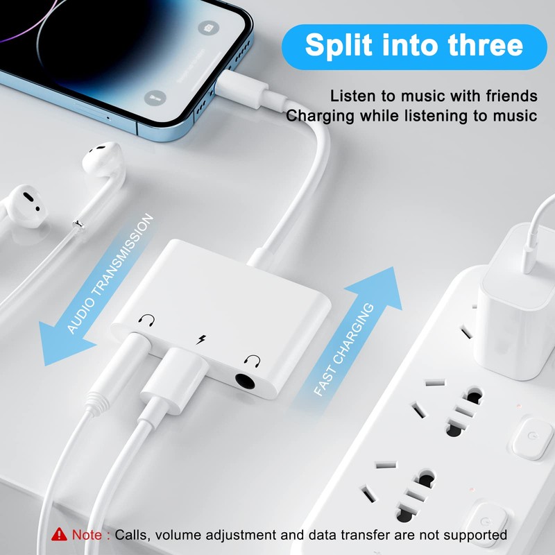 - Dual iPhone 3.5 mm headphone design: 3-in-1 iPhone headphone adapter with dual 3.5 mm audio jack and a charging port, iPhone jack adapter supports dual 3.5 mm headphones that work at the same time, and supports listening to music and charging your iPhone at the same time. You don't have to worry if your phone runs out of power while enjoying music or movies with your lovers, good friends, families. (Note: no phone call control. ).
