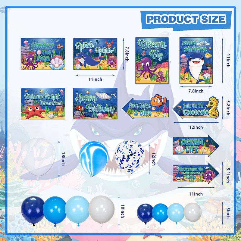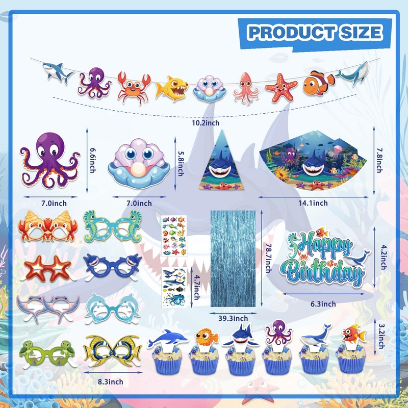 - WHAT YOU'LL RECEIVE - Our complete ocean birthday decorations set includes: 1 Backdrop, 24 Cupcake Topper, 82 Pcs Latex Balloons (12 Styles), 1 Banner, 1 Birthday Cake Topper, 10 Wall Signs, 8 Paper Glasses, 4 Centerpiecess, 1 Tablecloth, 2 Foil Curtain, 2 Temporary Tattoos, 1 Hat.