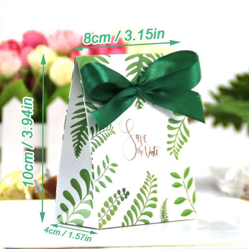 - This set includes 50 gift boxes made of high-quality cardboard, sturdy and eco-friendly, designed with vibrant green botanical prints and tied with elegant green ribbon.