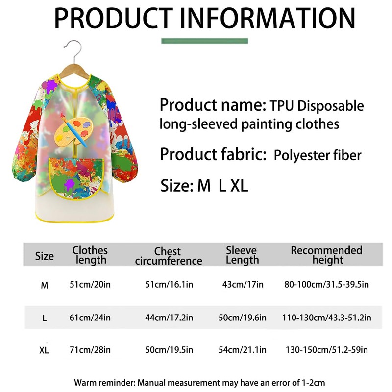 - Easy to clean: This painting apron is perfect for children to wear, as it can be wiped or easily cleaned with soap and water. Easy to put on and take off, this is a must-have for messy children.