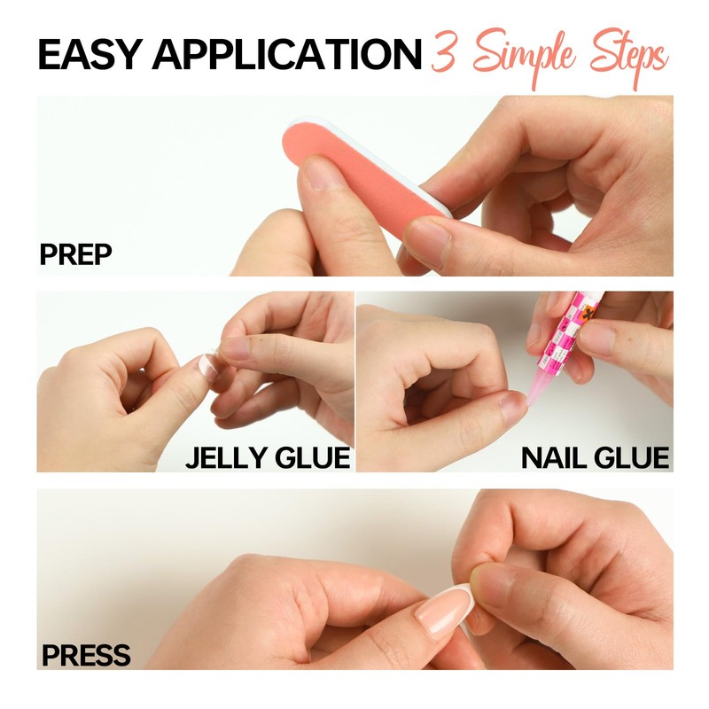 - Reusable 16 Sizes press on nails medium length are durable to last for 2 weeks. Package inclues:32 Pcs Press on Nails, Storage Box, Nail Glue, Adhesive Tabs, Double-sided Nail File, Cuticle Stick and Prep Pap.