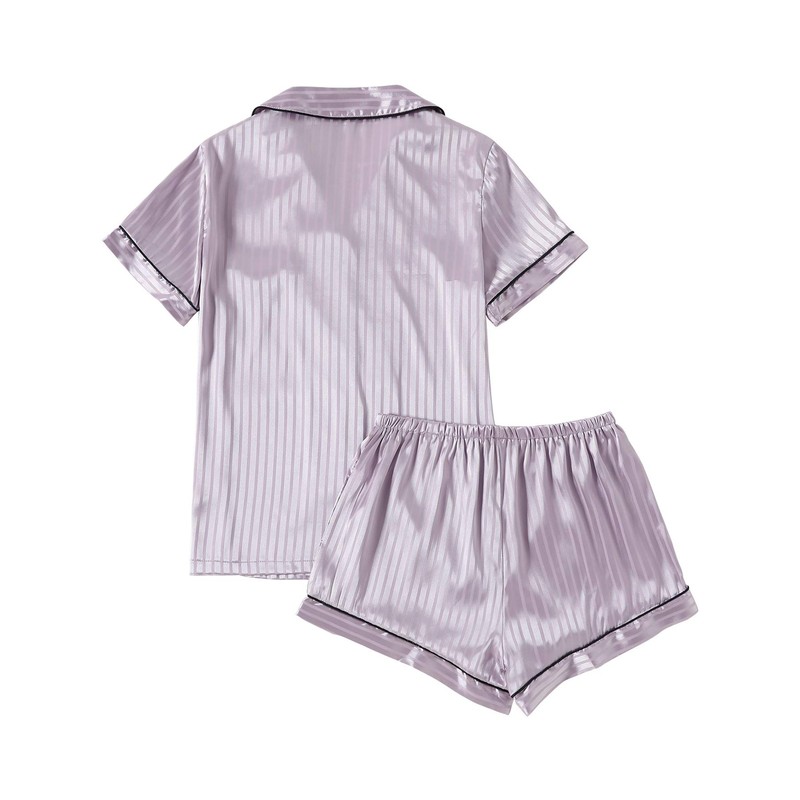 - Two piece satin pajamas set featuring with a button front short sleeve shirt and a pair of shorts.