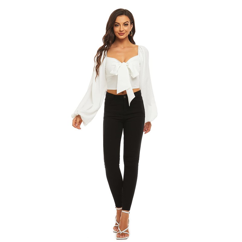 - Cropped length, pullover blouse. Tie knot front, lantern long sleeve, solid color, sweeheart neckline, shirred back blouse for women and girls.