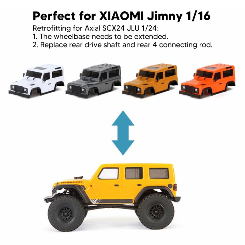 - Compatibility Plus: Ideal for 1/16 RC cars and SCX24 1/24, this shell requires modifications such as lengthening the wheelbase and replacing the rear drive shaft and the rear 4 connecting rods to fit perfectly, offering a tailored upgrade to your favorite RCs