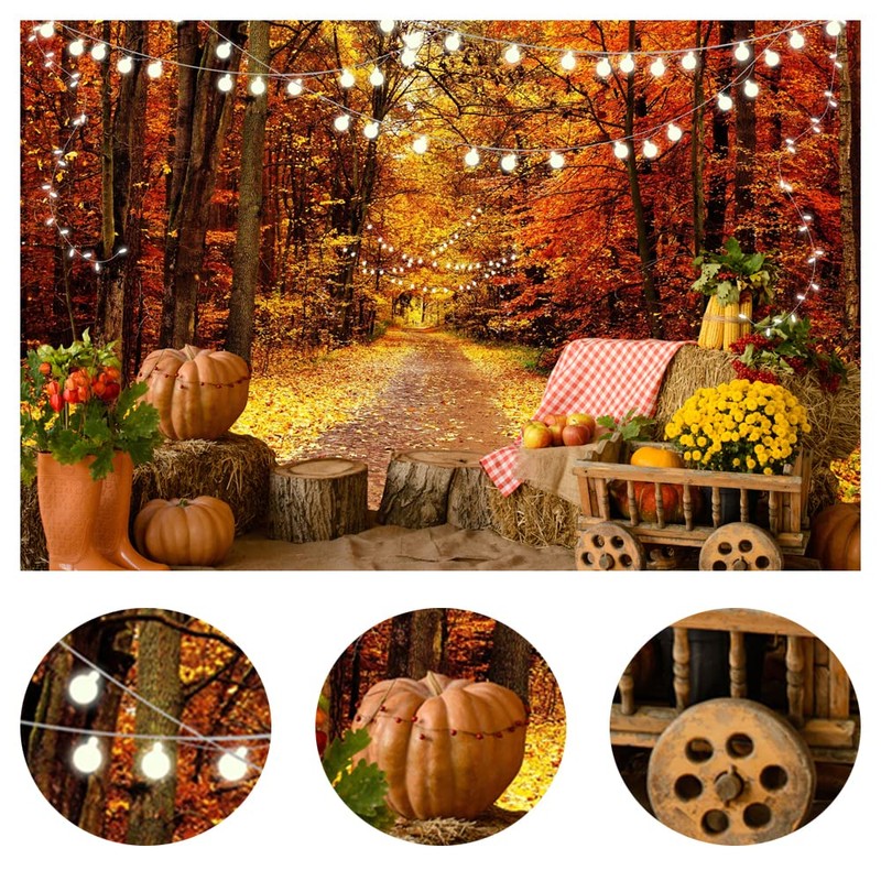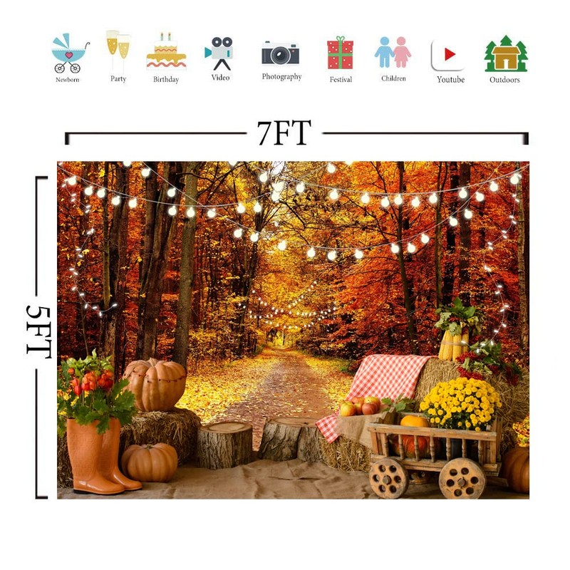 LYCGS 7X5FT Autumn Scenery Deciduous Backdrop Thanksgiving Background Pumpkin Harvest Hay Background Tree and Yellow Fall Leaves Backdrop Studio Props X-55