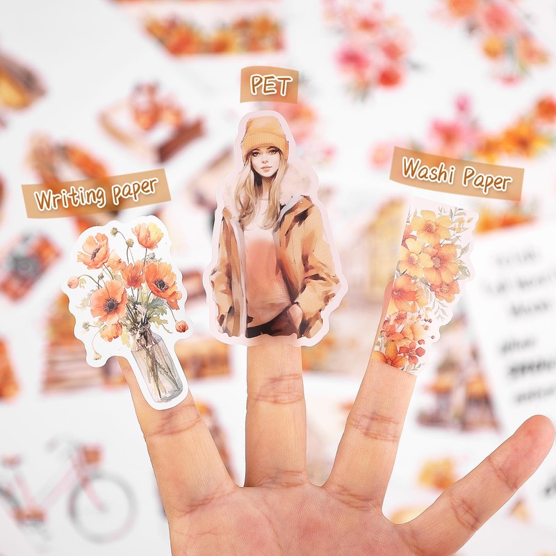 - There are 8 sheets of PET transparent stickers with matte finish, 10 sheets of opaque paper stickers with white background and 2 sheets of washi sticker with translucent texture.