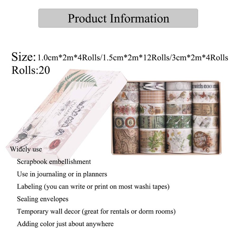 - 20 rolls with different designs, beautiful washi tape, masking tape, decorative tape
