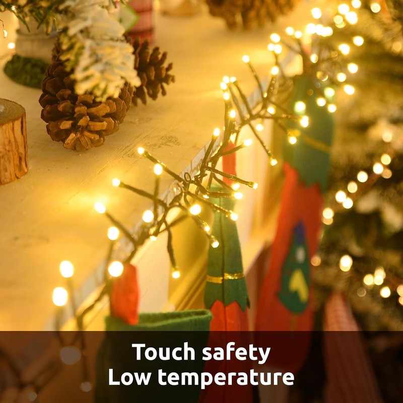- 【FAIRY LIGHTS PLUG IN】This cluster lights christmas are UL-certified for safe use. With a low voltage of 29V and cool-to-touch design, they are safe for family and pets to be around. The energy-efficient LED bulbs save up to 90% more energy compared to traditional incandescent lights, making them an eco-friendly choice.