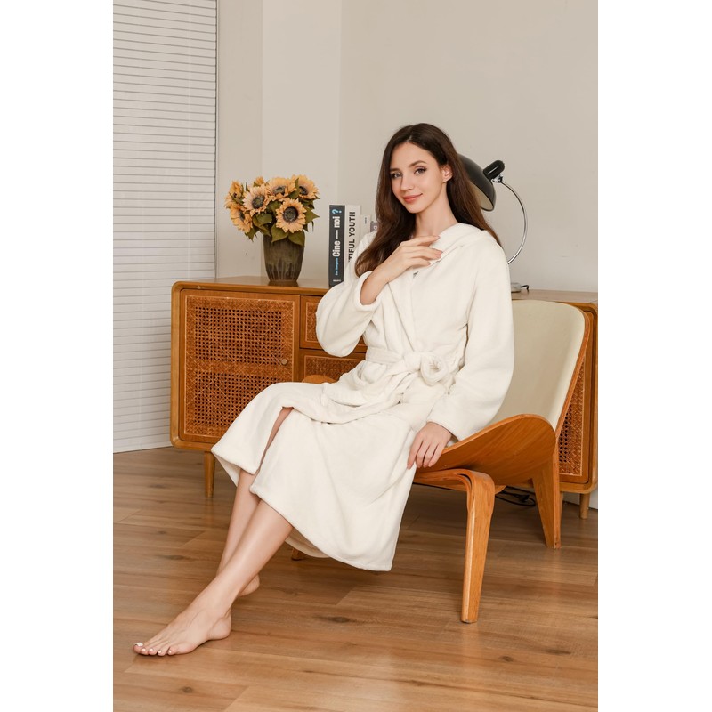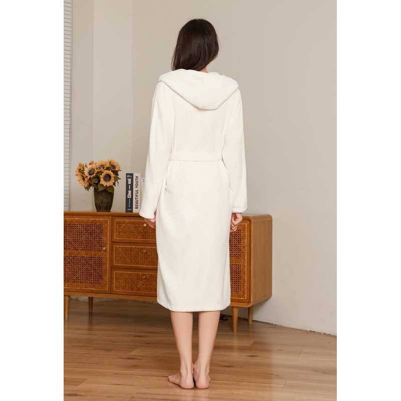 LYCY Womens Hooded Plush Long Robe, Soft Warm Bathrobe for Women Mid-Length Fluffy Spa Robe(WHITE,L/XL