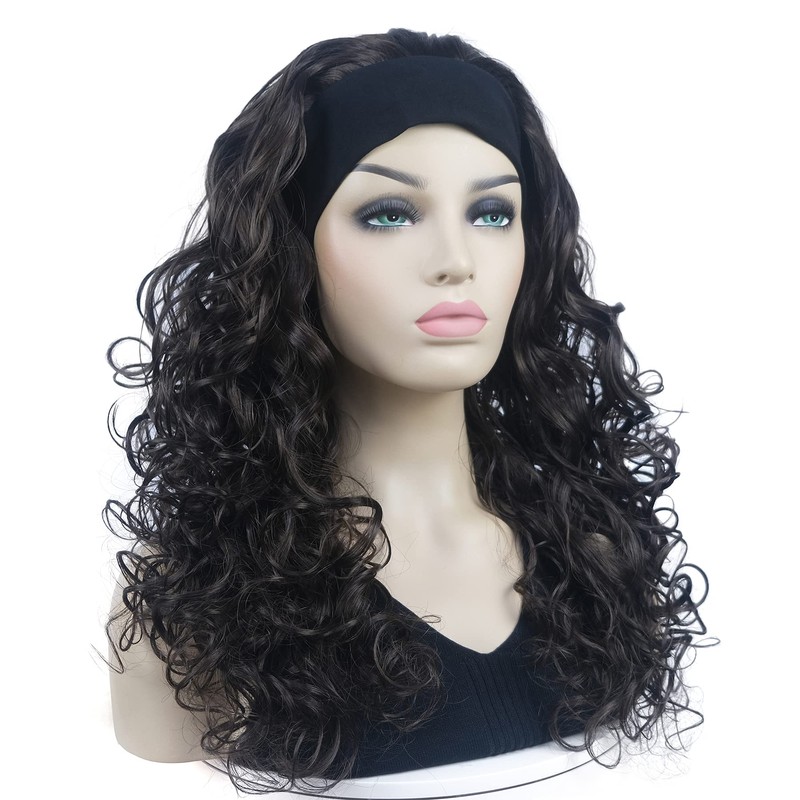 - Fashion Long Curly Hair 3/4 Black Headband Wig with Wig-Centering Design.
