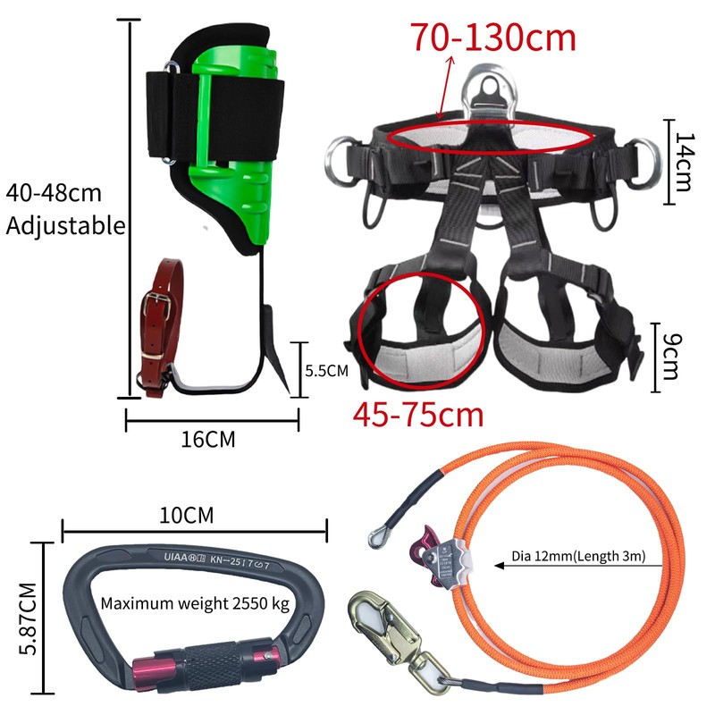 - Excellent Material: Tree climbing spikes are made of 45 # steel and PVC, with precision sewn protective straps. The Steel Core Flip Line is made of steel core and double-layer weaving, while the anti fall lock and carabiner are made of space aluminum material