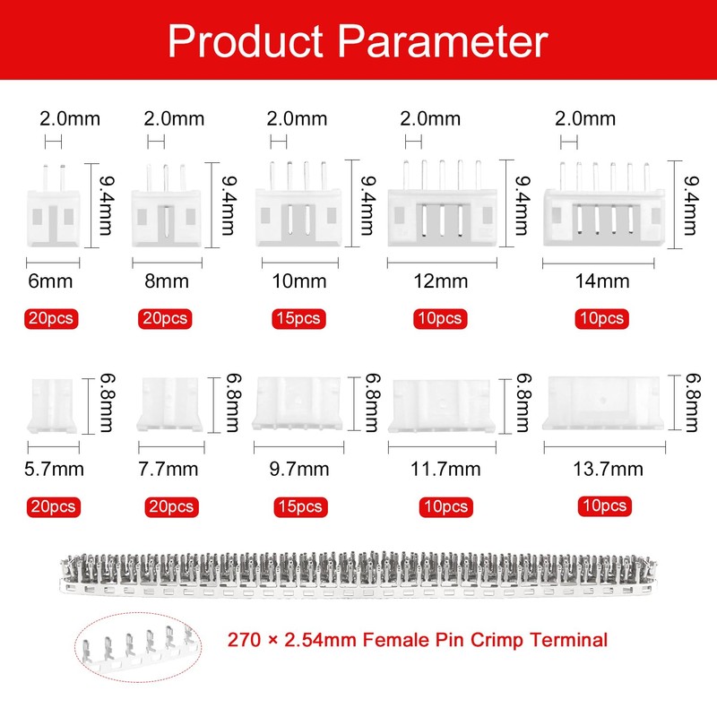 - Package Includes: his kit includes 150pcs female and male PH2.0mm 2/3/4/5/6 pin connector, 80pcs pre-crimped wire, 190pcs Female Pin Crimp Terminal.