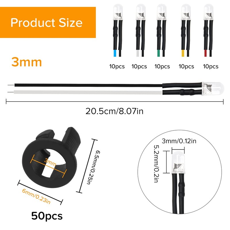 - Package Includes: 50pcs 3mm prewired LED diode lights (white, red, yellow, blue, green) + 50pcs 3mm led diode mounting holders.