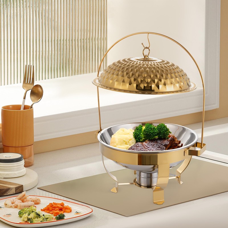 LyeXD Chafing Dishes for Buffet, 6.3QT Round Chafing Dish Buffet Set Hanging Lid Dining Stove w/Lid & Alcohol Burner, Stainless Steel Chafers and Buffet Warmers Sets Food Warmers for Partie (Gold)