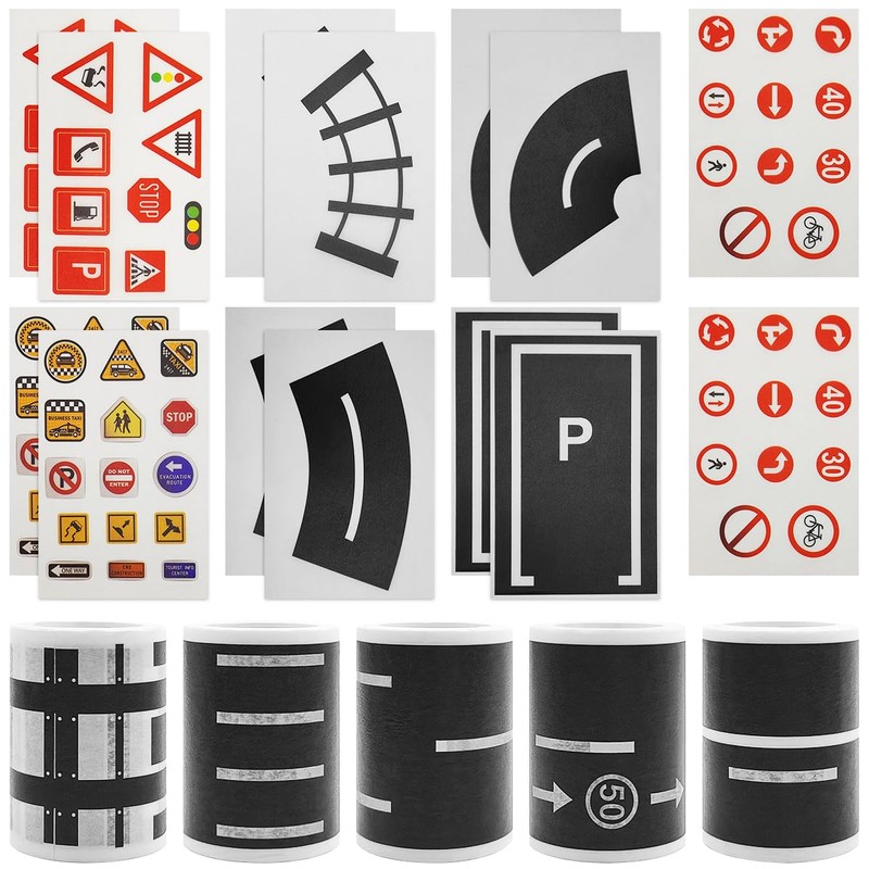 - COMPLETE ROAD SYSTEM IN ONE KIT: Includes 19 versatile components, 2 straight road rolls, large / small curves, parking slots, road signs, car decals, railway tracks, and speed limit labels (50 & 100). Design complex layouts for model displays, parking guides, or hobbyist projects.