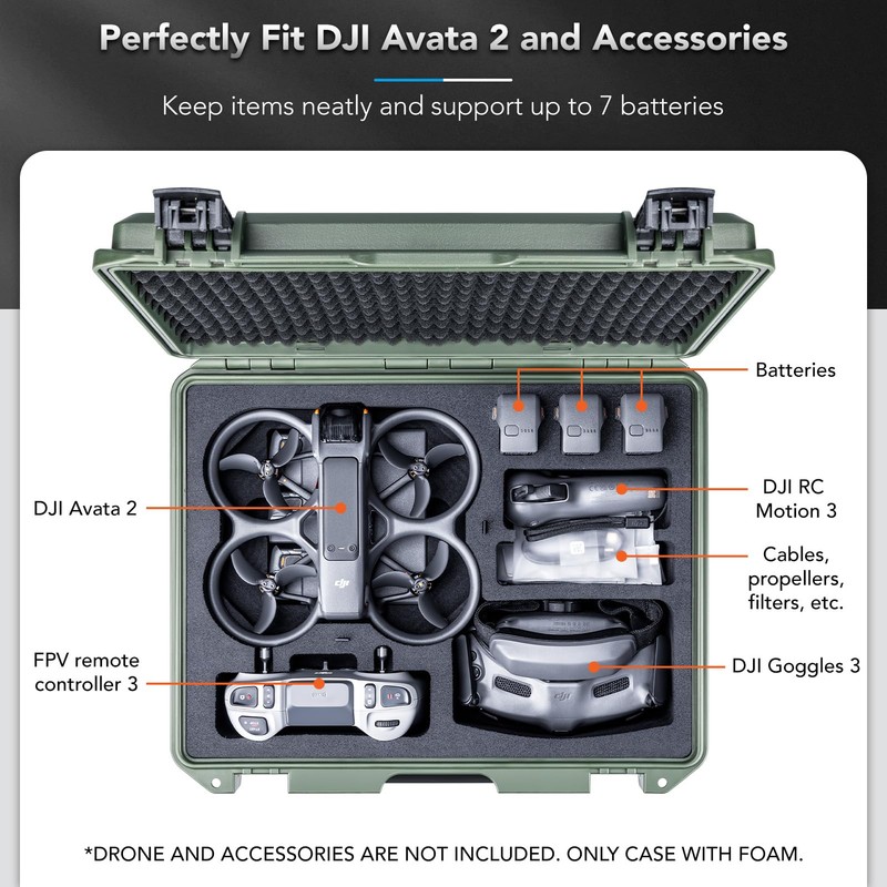 • STORAGE - Fit DJI Avata 2, DJI Goggles 3, RC Motion 3,FPV remote controller 3, up to 7 batteries, charging hub, power adapter, cables, filters, propellers, MicroSD cards, and more accessories