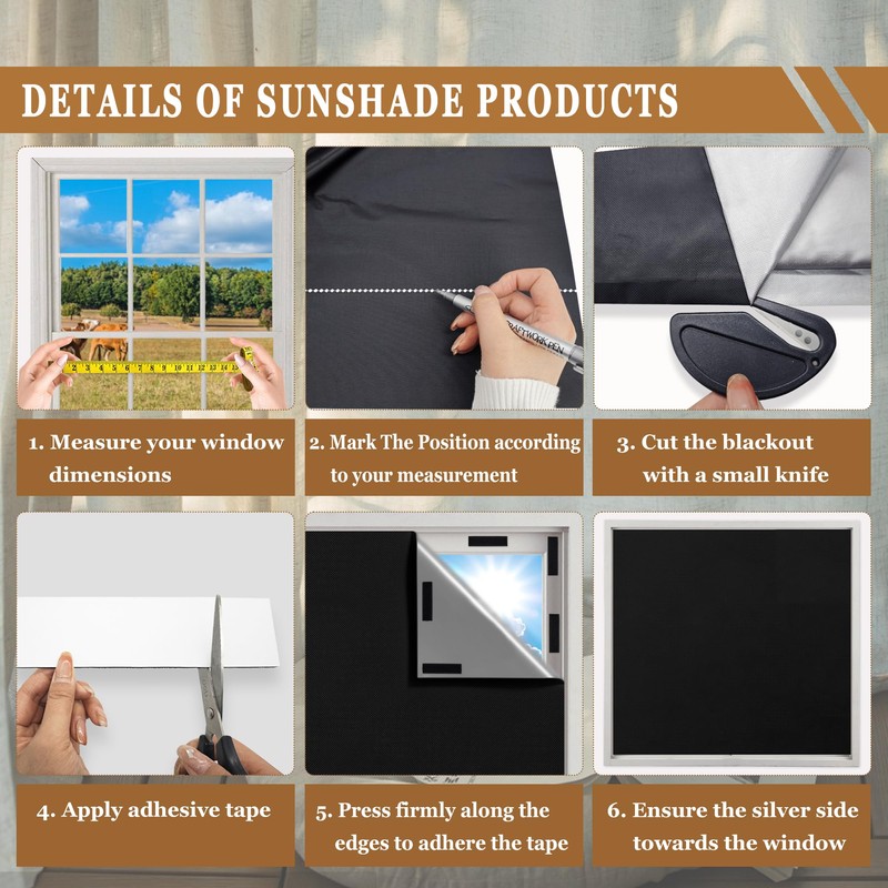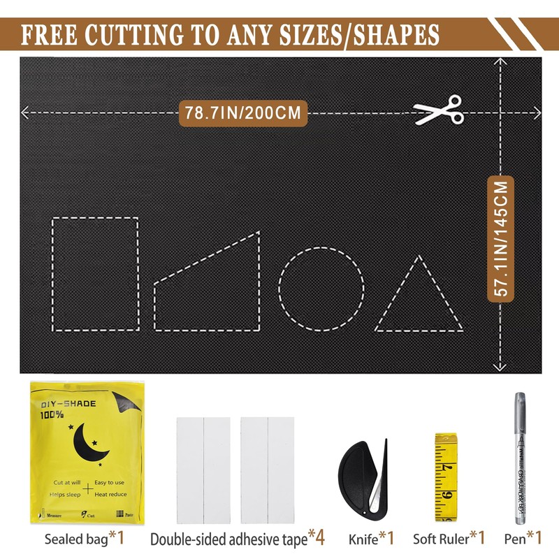 - ✂Free Cutting & Easy Assembly - 200 x 145 cm / 78.7 x 22.4 inch window privacy self-adhesive window film fits any window size and shape; All tools included and double-sided patches on each side to ensure 100% blackout and easy wearing