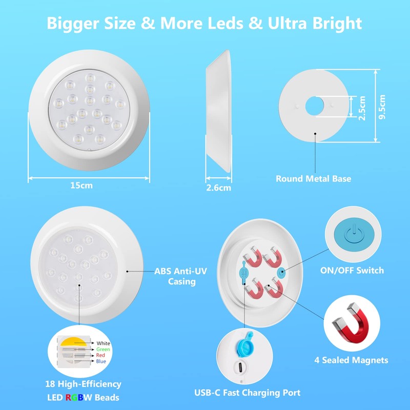 - Larger Size and Ultra-Brightness - Equipped with 18 high-efficiency RGBW LED beads. Which offers a wider and brighter color gamut, the additional white LEDs allow for pastel colors and convenient white lighting for dark areas. RF remote controls included, easy to change colors/modes, and 3 timer modes (2h, 4h, 6h) to automatically turn off the lights. Size: 15 x 2.5 cm.