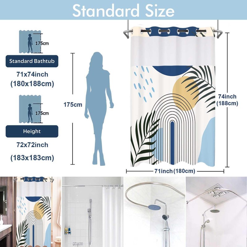 - THE SIZE: This mid century blue shower curtain no hooks sized at 71x74 inches it suitable for most bathtubs and bathroom decor whether it is at bathroom window or bohemian hotel bathroom, this bathroom shower curtain can give you a happy bath times ahead.