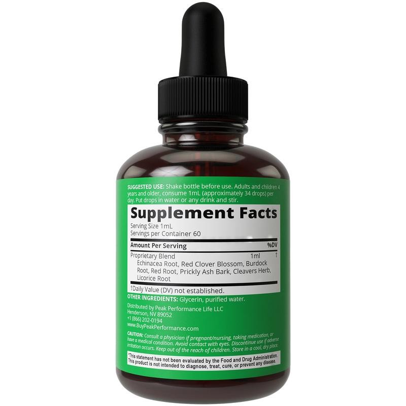 Peak Performance Lymphatic Drainage Support Drops are a natural, herbal formula designed to support healthy lymphatic function, circulation, and immune system wellness. Crafted with seven carefully selected antioxidant-rich herbs—including Echinacea Root, Red Clover Blossom, Burdock Root, Red Root, Prickly Ash Bark, Cleavers Herb, and Licorice Root—these drops help promote the natural clearance of cellular waste while supporting overall detoxification. Vegan, sugar-free, and third-party tested, this liquid supplement is safe, effective, and suitable for both men and women seeking enhanced lymphatic health and immune support.