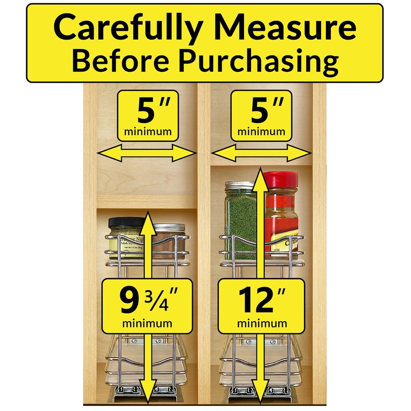 Lynk Professional® transforms any cabinet in your kitchen or pantry to the beauty and convenience of our slide out spice rack organizers. This innovative pull out spice rack organizer for cabinets gives easy slide out access to all the hidden spices in kitchen cabinets and pantries. Our exclusive ProGlide® industrial-grade full-extension steel dual ball bearing glide system ensures smooth sliding every time with a unique raised glide design to clear any cabinet lip, and even adjusts for the various depths of upper kitchen cabinets and pantry shelves. No need for special jars, you can keep your herbs and spices in their original containers. This special spice holder rack eliminates clutter in your cabinets, pantries, drawers, and on your countertops by organizing spices, condiments, oils, and other bottles in your kitchen cabinets. The heavy-duty thick polymer trays lock into place and protect your cabinets from spills while keeping even the smallest items stable. Our spice rack, engineered with commercial quality steel and a beautiful chrome finish, gives you unparalleled strength and durability for a lifetime of trouble-free use. And with our proprietary Easy Mount® design, setup is quick and easy with just 2 screws – included. The Lynk Professional pull out double spice rack holds up to 20 standard size spice jars (jars not included). The Lynk Professional® Spice Rack is available in multiple designs and sizes to fit all your needs. US Patent # D876,169 Product Dimensions: 4-1/4" W x 10-1/4" to 12-1/4" inch deep x 8-1/2" H