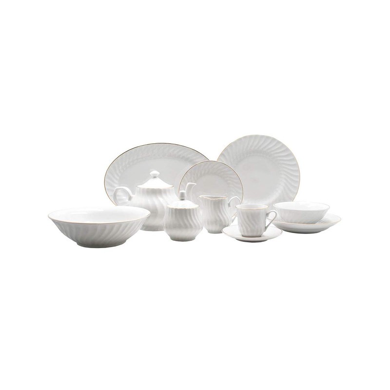 - White porcelain body. Each piece is shaped with a rippled swirl shape.