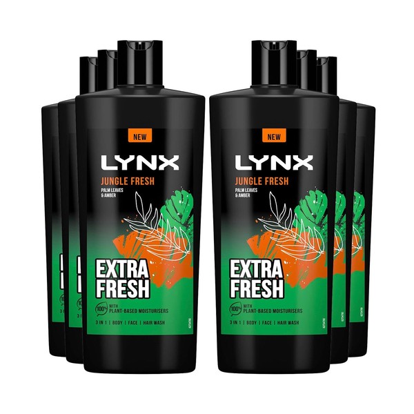 "Transform your shower from ordinary to extraordinary with Lynx Jungle Fresh 3-in-1 Body Wash: an adventure into the wilderness that'll have you coming up with excuses to get dirty just so you can experience it again. This hair, face and body cleanser kicks odour to the kerb with a revitalising palm leaf and amber scent C as fresh as Nature herself. No matter how big or small life gets, you'll always feel refreshed. Better still, our body wash contains 100% plant-based prebiotics and 5x more moisturisers to hydrate your skin every time you shower. Revealing clean, fresh-smelling skin. Boost your fragrance game with our range of shower gels.Features:?Embrace your irresistibly untamed side with Lynx Jungle Fresh 3-in-1 Body Wash?This moisturising shower gel features an exhilarating palm leaf & amber scent?Our body wash washes away bacteria and provides up to 12 hours of invigorating fragrance?This hair, face and body cleanser is made with 100% plant-based moisturisers to keep your skin feeling irresistibly soft, naturallyHow to Use: Squeeze out Lynx Jungle Fresh hair, body and face wash into your hands and work into a rich, creamy lather. Massage it all over your body and rinse thoroughly.Ingredients: Aqua, Sodium Laureth Sulfate, Glycerin, Sodium Chloride, Cocamidopropyl Betaine, Parfum, Sodium Benzoate, Citric Acid, Lactic Acid, Disodium EDTA, PPG-6, Saccharide Isomerate, Limonene, CI 19140, CI 42090Safety Warnings: Avoid contact with eyes. If contact occurs, rinse thoroughly with water.Box Contains: Lynx 3-in-1 Body Wash Shower Gel Extra Jungle Fresh "