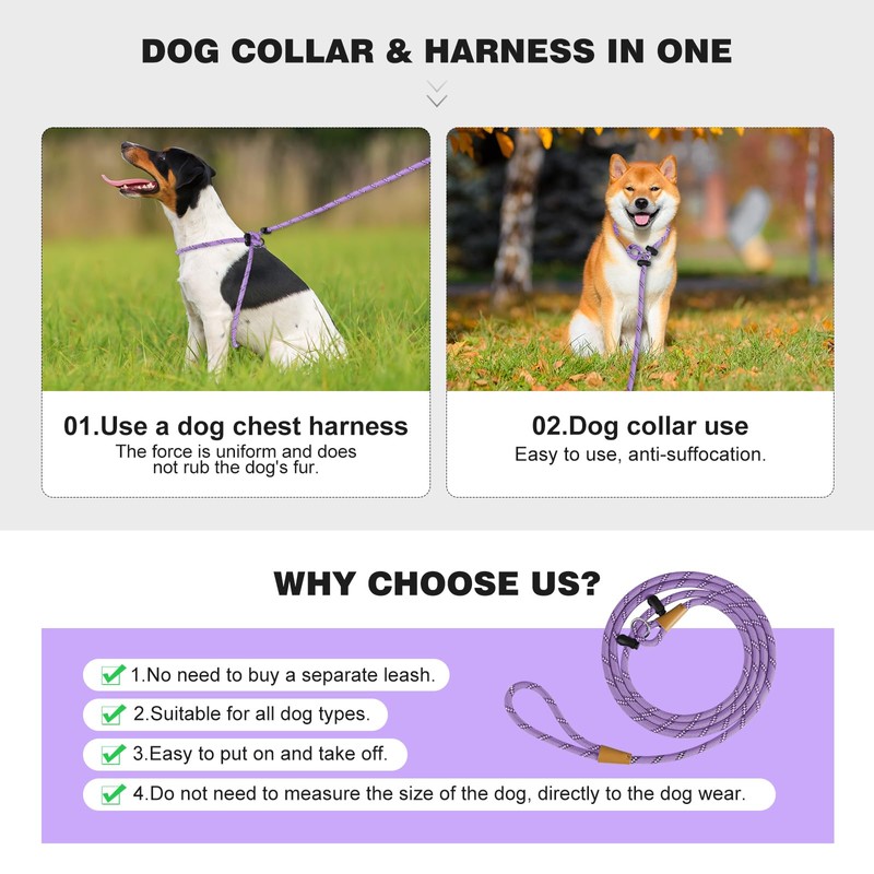 - Long lasting& Easy to Use: Made of sturdy nylon rope and quick-snap buckles, this dog leash harness is built to last and simple to put on