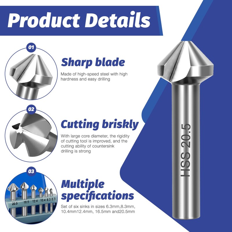 - Easy and precise application: the countersink set has a 90° countersink angle and the blade tip allows for more accurate processing of sharp and precise holes in all common materials such as steel, cast steel and non-ferrous metals. 3 cutting edges make it more concentric and smoother to use.