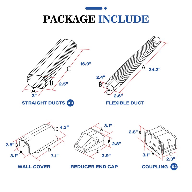 - Parts Included - Straight*3;Flexible Ducts*1;Coupling*2;Wall Cover*1 ;Reducer End Cap*1;Screw.