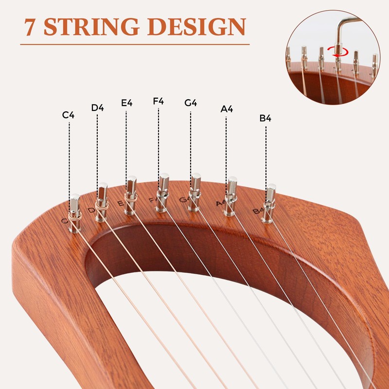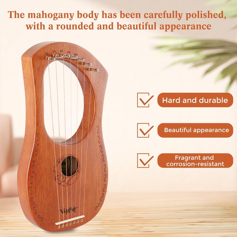 - High Quality Materials: VANPHY 7 string lyre harp is carefully made of naturally air-dried mahogany. The harp instrument has been repeatedly polished, and the edges of the body are rounded for comfortable use. The laser-engraved notes are not easy to wear and have a long service life.