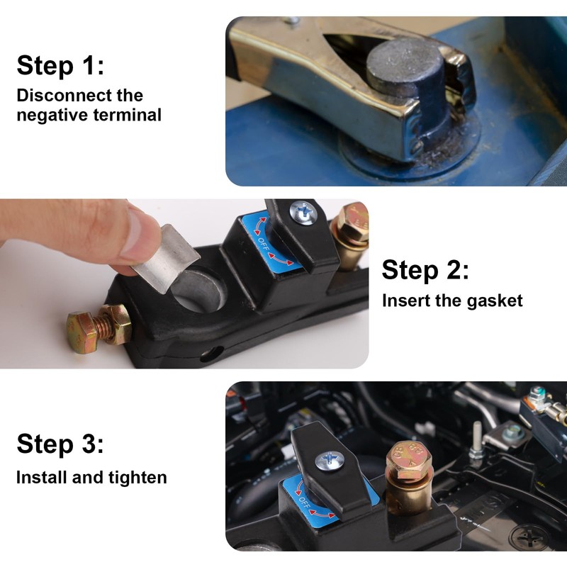 - Easy to Use: First, unplug the negative cable on the negative terminal. Second, place gaskets over the negative terminal and then put in the battery cut off switch. Third, tighten it with the screw nuts on its side. Fourth, put the negative cable into the copper cylindrical device on the other side and tight it with a wrench.