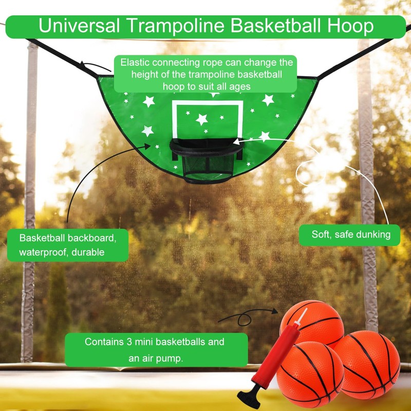 - Product Content: You will receive 1 trampoline basketball support board, 1 basketball hoop, 3 basketballs and 1 air pump. This comprehensive kit ensures immediate setup and broad compatibility with most trampolines.