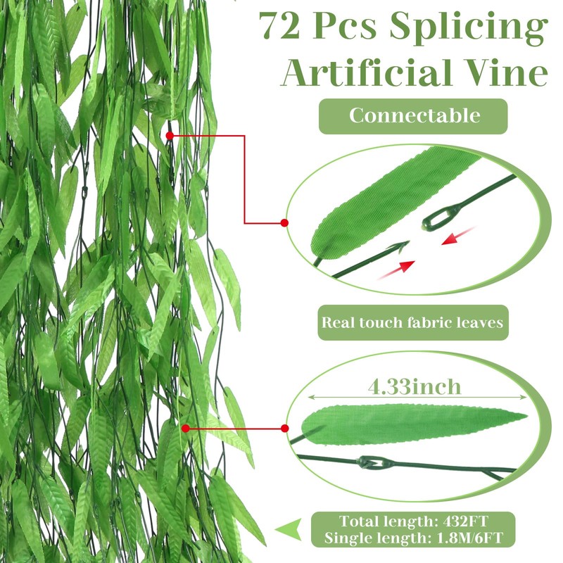 Lyrow 72 Pcs 432 ft Artificial Vine Greenery Garland Hanging Willow Vines for Garden Decor Fake Seaweed Rattan Wicker for Home Wedding Balcony Windowsill Decorations