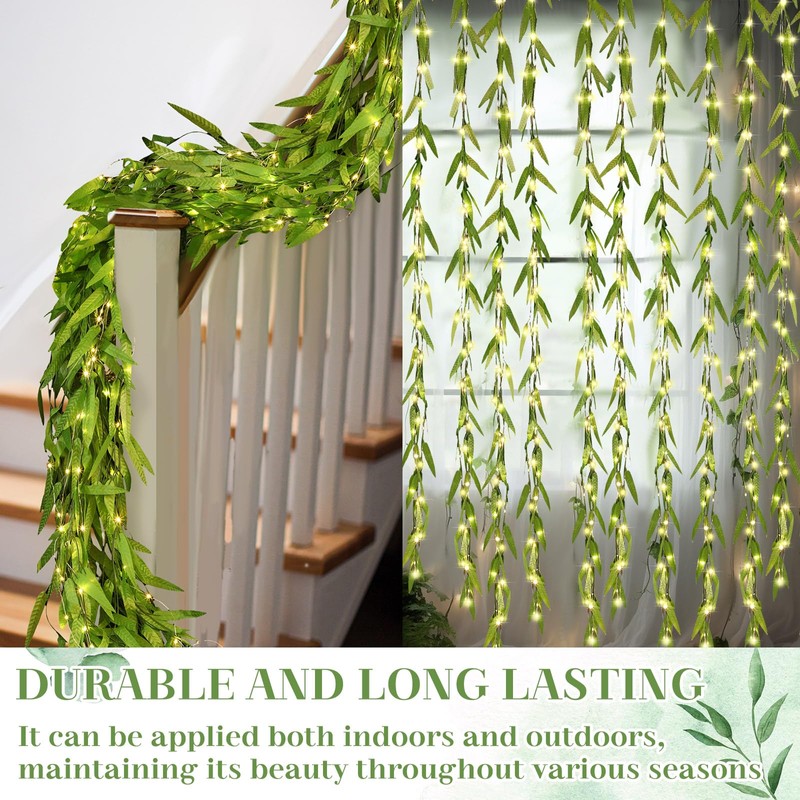 - Quality Material of Willow Garland: comprising of fabric leaves and plastic, our willow leaves garland showcases a compelling blend of durability and aesthetic appeal; This makes it the ideal choice for your greenery garland with lights, providing you with both beauty and longevity; Apart from offering a natural appearance, the fabric leaves are sturdy and resist wear and tear