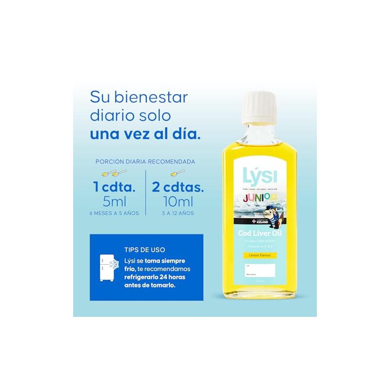 LYSI LSI, Omega 3 para nios en Aceite de Bacalao, Sabor limn, Contiene Vitaminas A, D3 y E, junior, desde los 6 meses de edad, Sin gluten y azcar,...