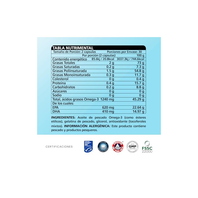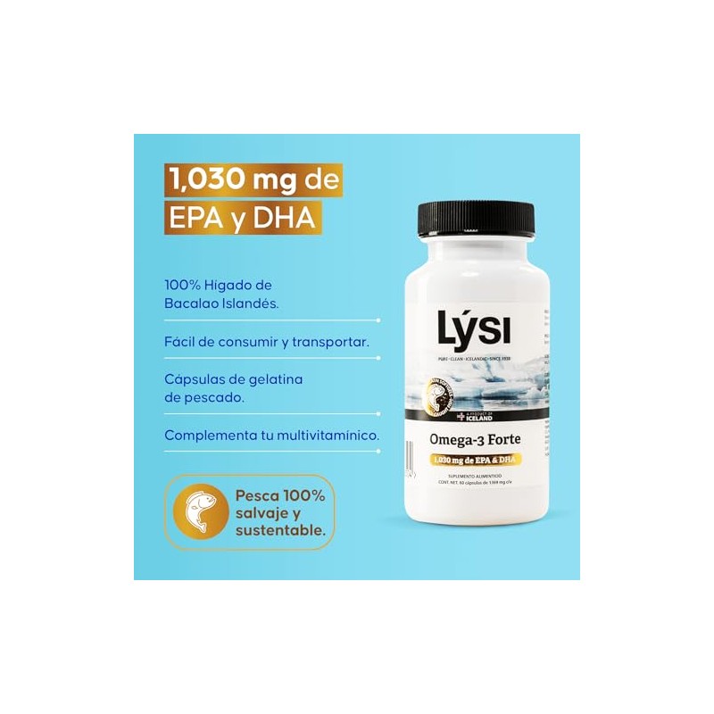 Lysi Omega-3 Forte 60 Capsulas, 1030 mg de EPA DHA, Aceite de Pescado 100 Salvaje y Sustentable, Importadas de Islandia.