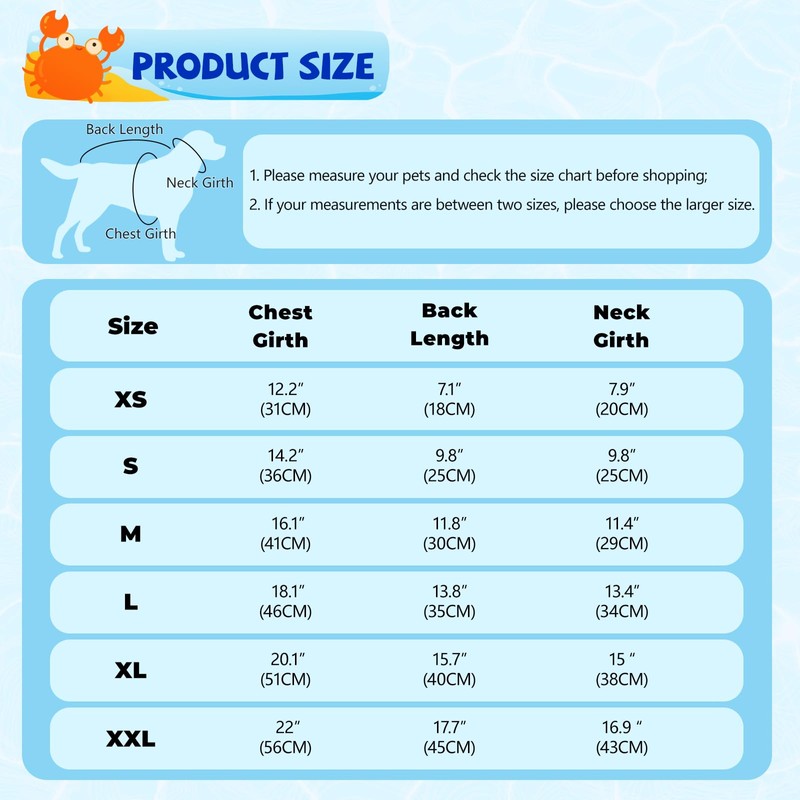 - XXL: Body Length is 17.8" / 45cm, Chest Girth is 21.7"/ 56cm, Neck Girth is 16.9" / 43cm, recommended for dogs between 22-28lb.